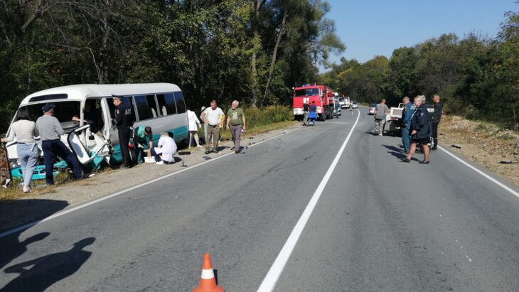 Авария произошла накануне на автодороге Раздольное – Хасан. Погиб один человек и восемь пострадали. По данным МВД, 59-летний водитель Toyota Hilux выехал на полосу для встречного движения и столкнулся с автобусом Toyota Coaster.
