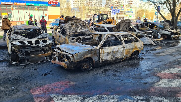 Пожар произошел ночью 28 апреля возле дома № 9 на улице Кустанайской. В результате ЧП сгорело семь автомобилей. Площадь возгорания составила 40 квадратных метров. Пострадавших нет.