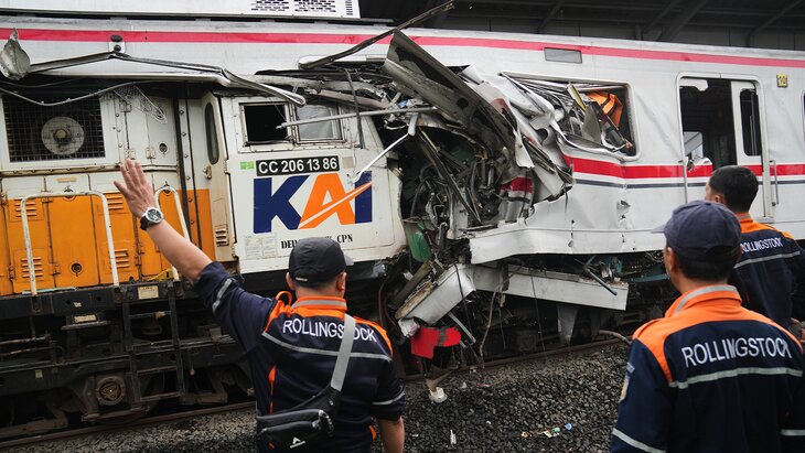 Авария произошла на станции "Бекаси-Тимур" 27 апреля. Поезд дальнего следования протаранил задний вагон пригородной электрички, предназначенный для женщин.