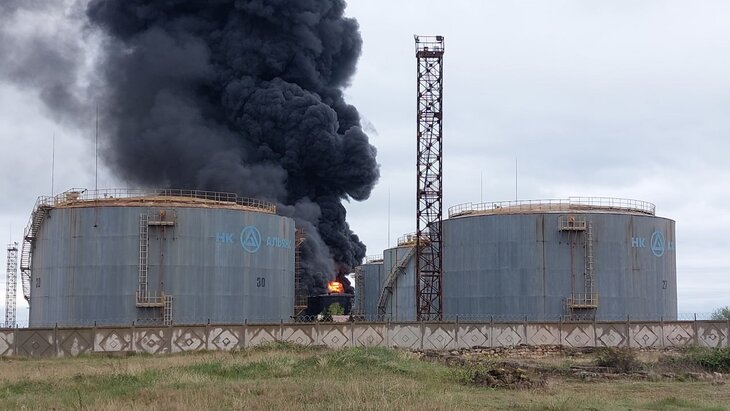 Предварительно, возгорание произошло из-за атаки беспилотника. Власти Севастополя заверили, что пожар не угрожает гражданским объектам.