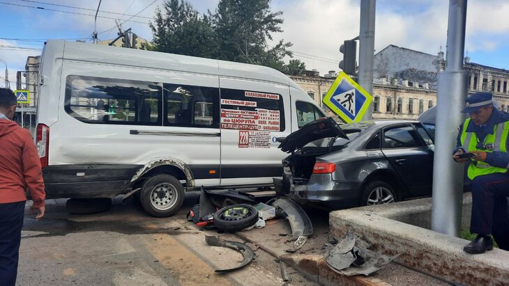 На пересечении улиц Пушкина и Карла Маркса столкнулись Ford Transit, Subaru Forester и Audi A4. От удара автобус отбросило на трех пешеходов.