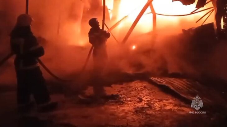 В ведомстве отметили, что тушение огня осложняет высокая горючая нагрузка. На месте работают 55 специалистов и 27 единиц техники МЧС. Информация о возможных пострадавших не поступала.