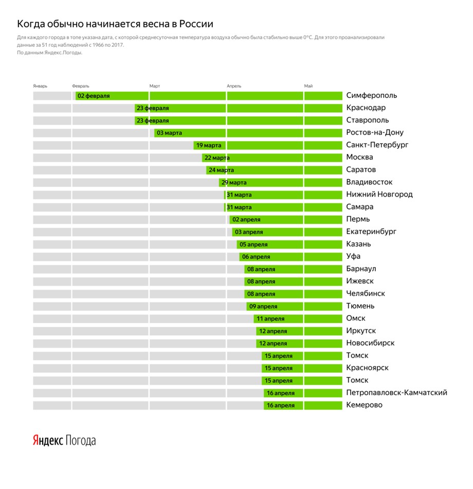 Аналитики "Яндекс.Погоды" проанализировали данные с 1966 до 2017 год и определили, когда в российские регионы придет весеннее тепло.
