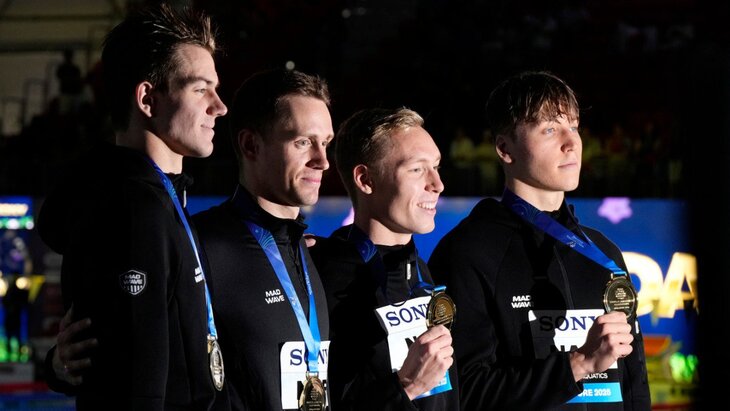 Спортсмены Мирон Лифинцев, Кирилл Пригода, Андрей Минаков и Егор Корнев преодолели дистанцию за 3 минуты 26,93 секунды. На втором месте оказались французы, отставшие от российской сборной на 1,03 секунды. Американцы получили бронзу, с отставанием в 1,69 секунды.