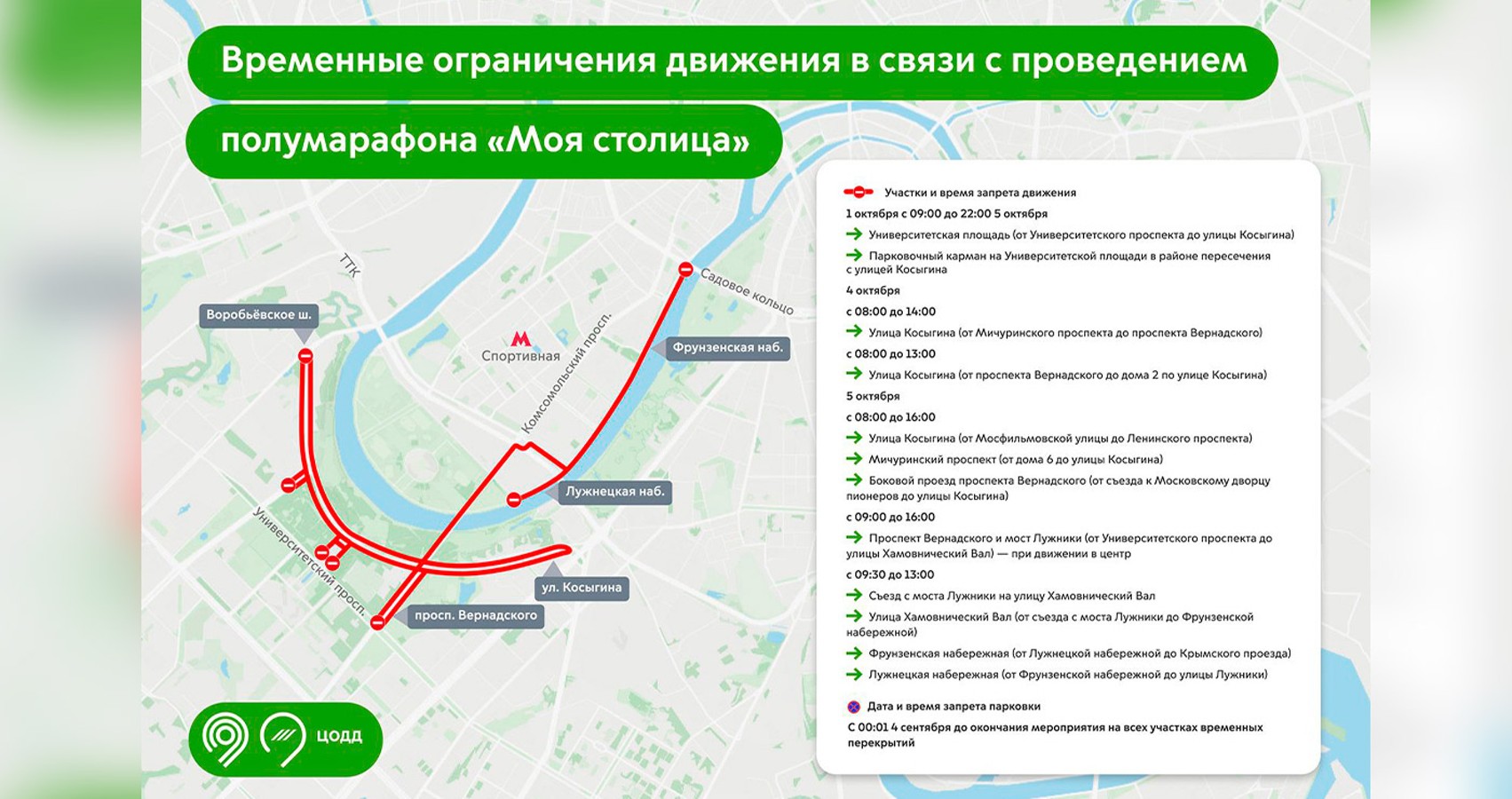 В Центре организации дорожного движения (ЦОДД) сообщили, что в связи с проведением полумарафона перекроют движение на следующих участках в районе Воробьевых гор: