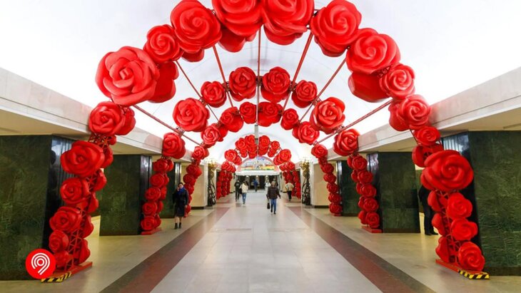 По словам заместителя мэра по вопросам транспорта и промышленности Максима Ликсутова, потолочный свод станции украсят более 400 алых роз разного размера. Бутоны выполнены из пластичного материала, который позволяет точно повторить форму цветов. Станция будет украшена до 23 марта включительно.
