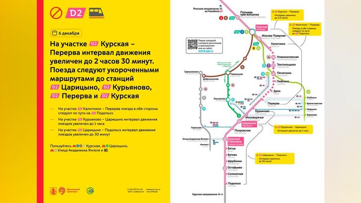 В частности, до 2,5 часов увеличатся интервалы на участке от станции Курская до станции Перерва, до 1 часа – от Курьянова до Царицына, до 30 минут – от станции Царицыно до станции Подольск.