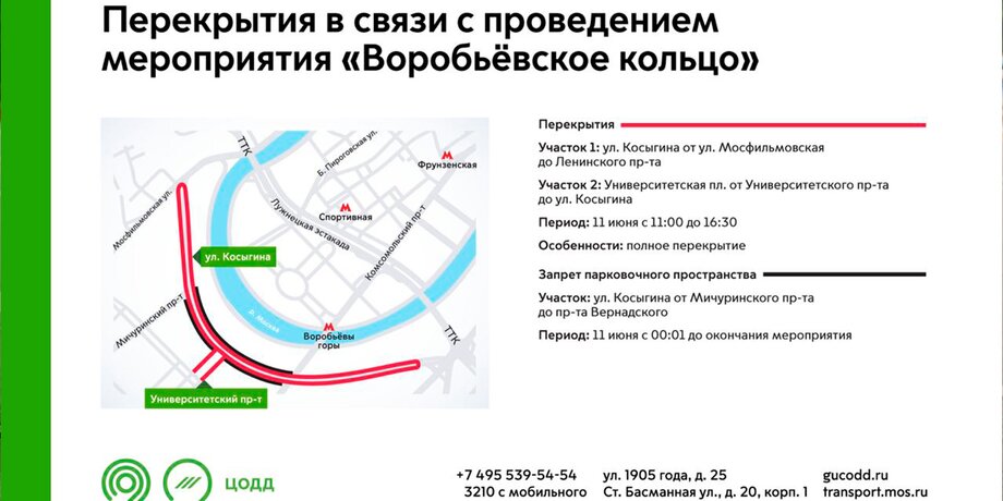 11 июня с 00:01 и до окончания мероприятия будет также запрещена парковка на улице Косыгина от Мичуринского проспекта до проспекта Вернадского.