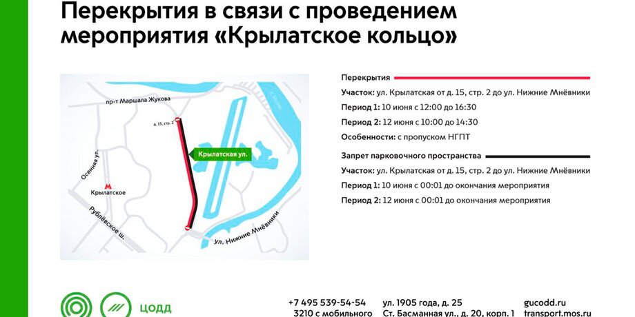 Также в связи с проведением мероприятия перекроют Крылатую улицу (участок от дома 15, строения 2, до улицы Нижние Мнёвники). Ограничения будут действовать с 12:00 до 16:30 пятницы, 10 июня, и с 10:00 до 14:30 воскресенья, 12 июня. Однако проезд по данным участкам будет разрешен только с пропуском НГПТ.