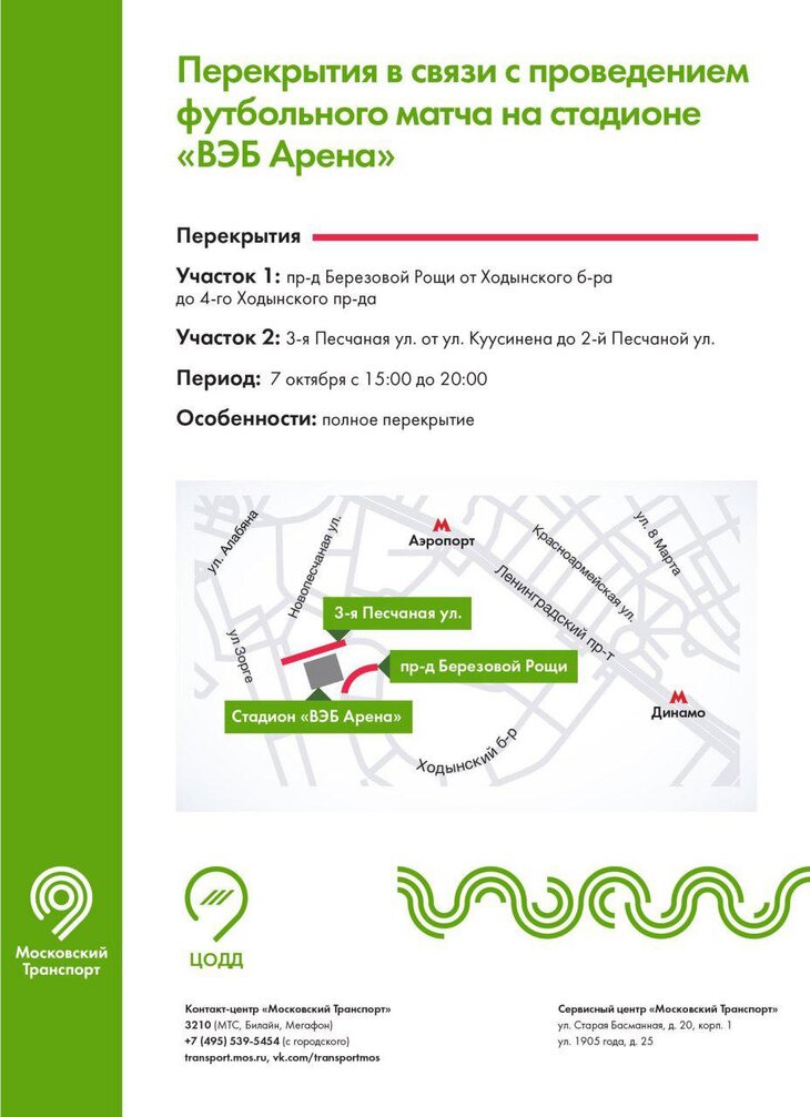 Кроме того, 7 октября с 15:00 до 20:00 будет перекрыт участок проезда Березовой Рощи от Ходынского бульвара до 4-го Ходынского проезда и по участку 3-й Песчаной улицы от улицы Куусинена до 2-й Песчаной. Это связано с проведением футбольного матча между сборными России и Южной Кореи на "ВЭБ Арене".