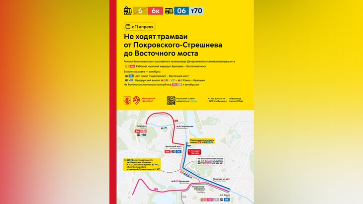 Временные ограничения будут действовать с 11 апреля по середину мая. Вместо трамвая 6 горожан призвали пользоваться коротким маршрутом 6к от Братцева до Восточного моста. Он будет работать ежедневно в течение всего дня. Из-за особенностей сервисного обслуживания на маршрут 6к выйдут трамваи предыдущего поколения с переменным уровнем пола.