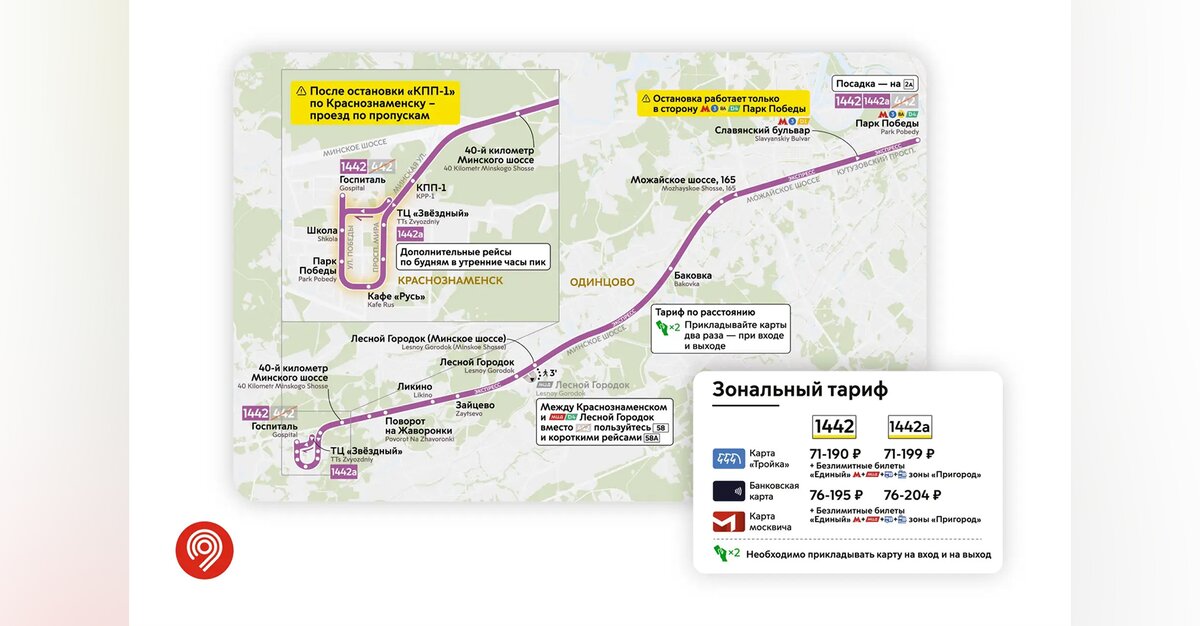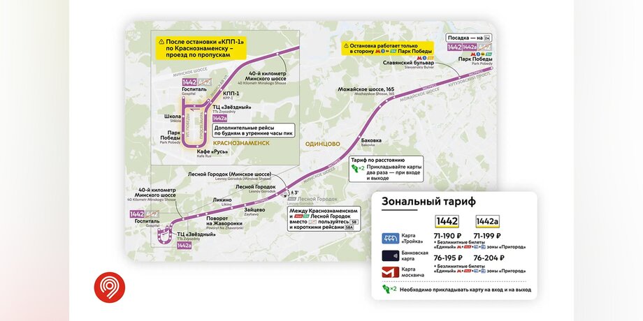 Уточняется, что дополнительный маршрут 1442А будет совершать 4 рейса из Краснознаменска в Москву в самое востребованное время по утрам. Затем автобусы продолжат работать на маршруте 1442.