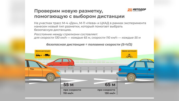 Разметка будет в виде стрелок или уголков-шевронов, уточнили в "Автодоре". Расстояние между ними начнет показывать нужную дистанцию между транспортными средствами. При этом на участках, где максимальная скорость достигает 110 километров в час, расстояние между элементами разметки будет назначено в 55 метров, а на дорогах с ограничениями в 130 километров в час – 65 метров.