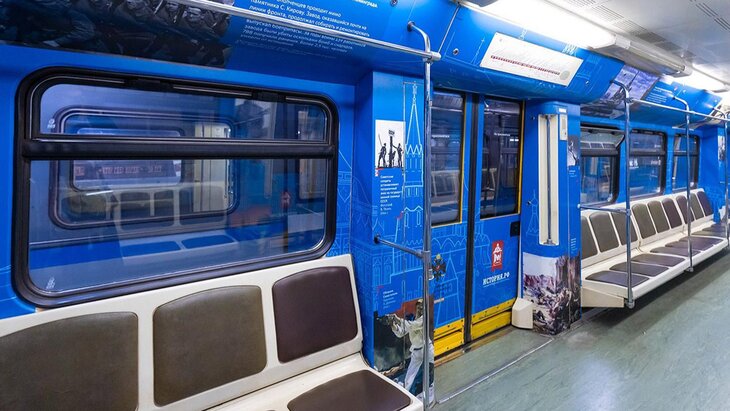 Поезд украсили изображения новых учебников истории и мемориалов, установленных или отреставрированных Российским военно-историческим обществом. При его содействии в Московском метрополитене запустили уже 17 тематических поездов.