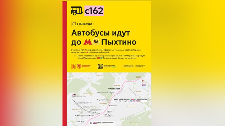 Таким образом, жители ЖК "Середневский лес", "Цветочные поляны" и поселка Марьино получат возможность добраться до Солнцевской линии метрополитена. При этом в связи с административной реформой в ТиНАО маршрут через Марушкино до станции МЦД Толстопальцево больше не будет обслуживаться.