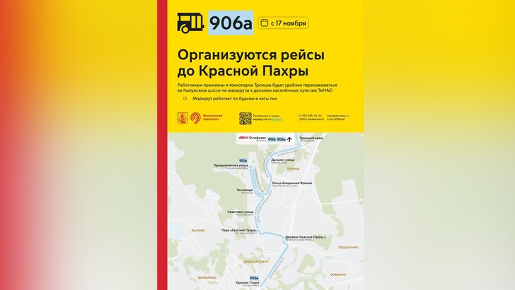 Вместе с тем с 17-го числа будет запущен рейсовый автобус 906а, который будут курсировать до Красной Пахры. Нововведение улучшит транспортные условия для работников промзоны и технопарка в Троицке. Они получат возможность удобнее пересаживаться на маршруты до дальних населенных пунктов ТиНАО на Калужском шоссе.