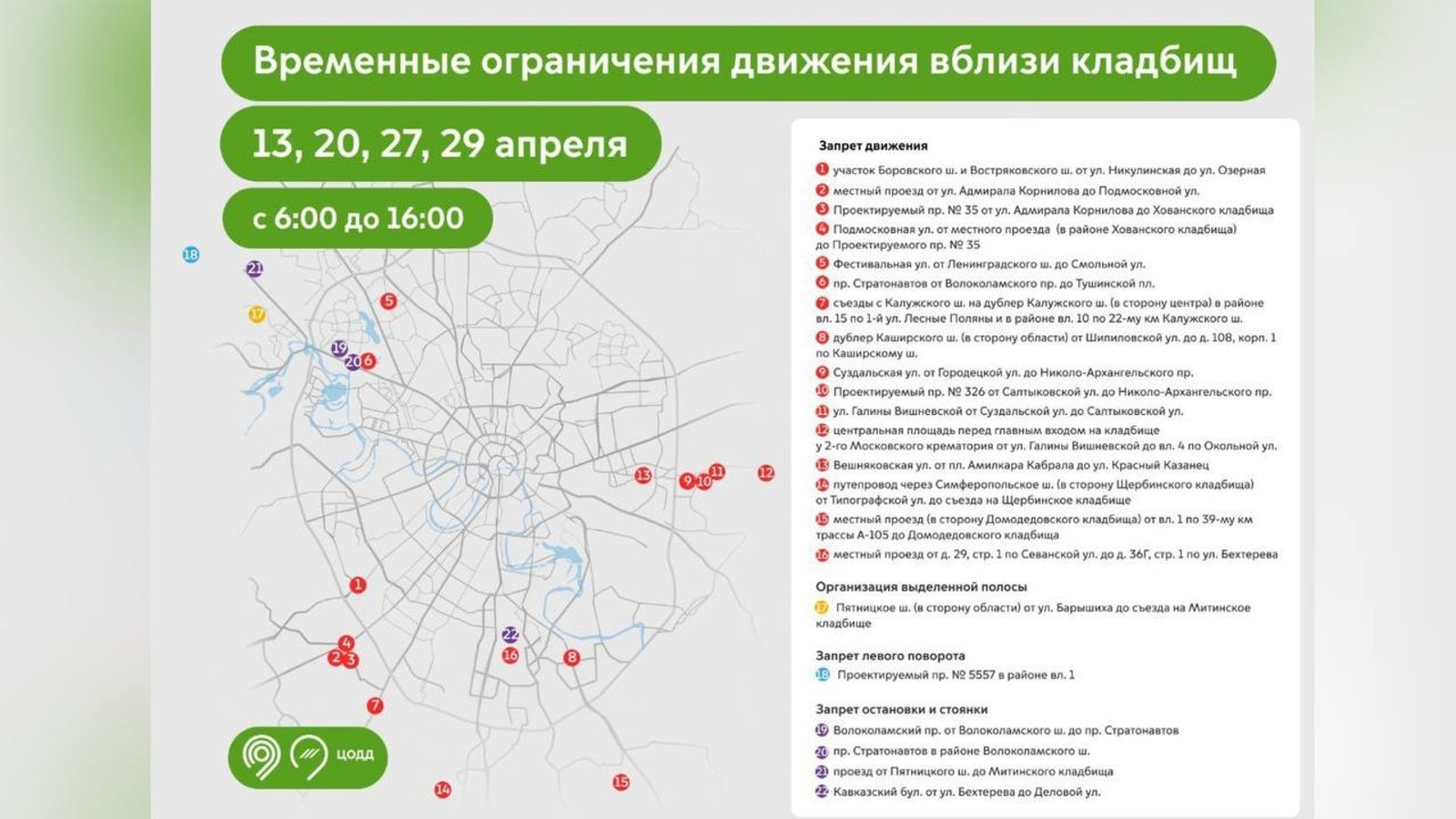 В эти даты с 06:00 до 16:00 будет закрыто движение на некоторых улицах возле кладбищ в ряде районов ВАО, ЮЗАО, ЮАО, САО, ЗАО, СЗАО, ТиНАО.