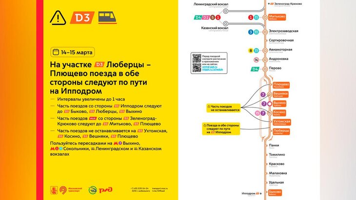 ТранспортИнтервалы движения на МЦД-3 увеличат до 1 часа 14 и 15 марта
