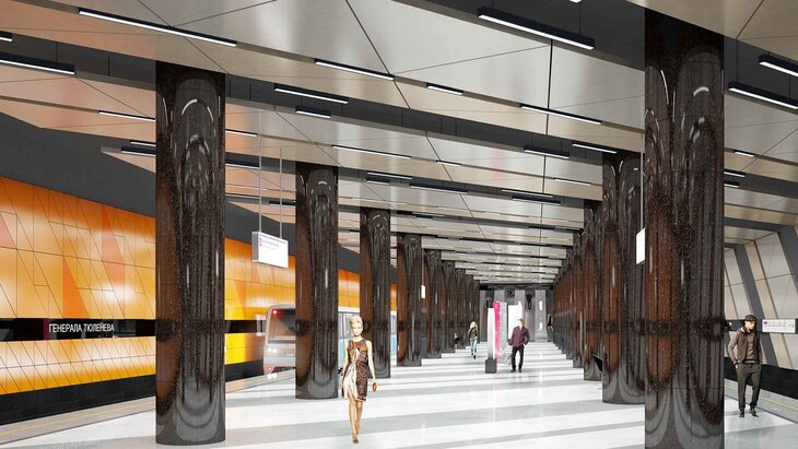 "В основе архитектурного решения будущей станции лежит применение ассиметричной композиции – гранит и габбро будут уложены по диагонали, создавая изображение, которое перекликается с аналогичным рисунком потолка", – отметил он.