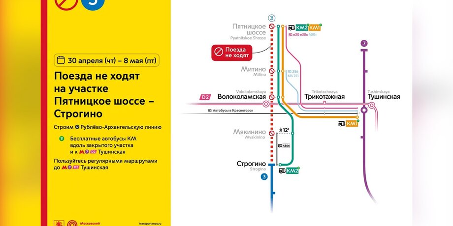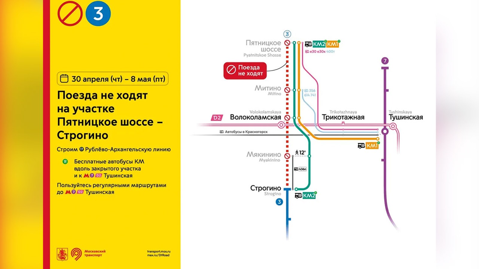 Ограничение будет действовать с 30 апреля по 8 мая включительно. Нельзя будет воспользоваться станциями "Мякинино", "Волоколамская", "Митино" и "Пятницкое шоссе".