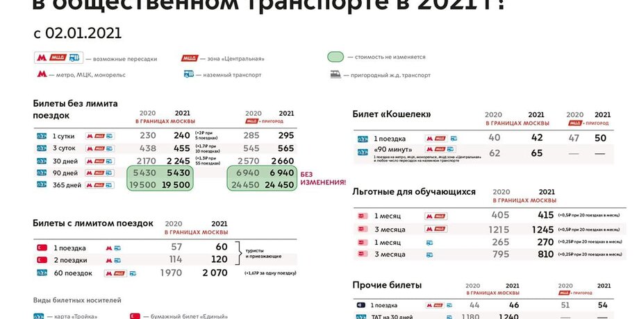 "Мы в первую очередь постарались избежать повышения тарифов для наших постоянных пассажиров, пользующихся билетами на 90 и 365 дней, поэтому нам удалось сохранить стоимость этих проездных. Изменения остальных тарифов будут минимальными, это вынужденная мера. Несмотря на пандемию, московский транспорт весь 2020 год работал в полном объеме – без снижения числа рейсов, полностью сохраняя частоту движения. При этом упала на треть билетная выручка. Кроме того, 2020-м выросли и продолжат расти в 2021 году затраты на дизельное топливо, электроэнергию, инфраструктуру и комплектующие", – заявил первый заместитель руководителя столичного департамента транспорта Сергей Андрейкин.