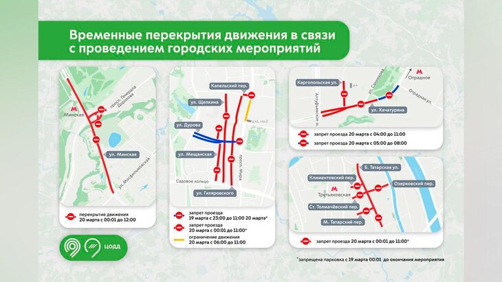 В частности, с 23:00 19 марта до 11:00 следующего дня движения не будет на улице Дурова. С 00:01 до 11:00 20 марта нельзя будет проехать по улицам Щепкина, Мещанской, Гиляровского и Большой Татарской, а также в переулках Капельском, Выползове, Старом Толмачевском, Климентовском, Озерковском и Малом Татарском.
