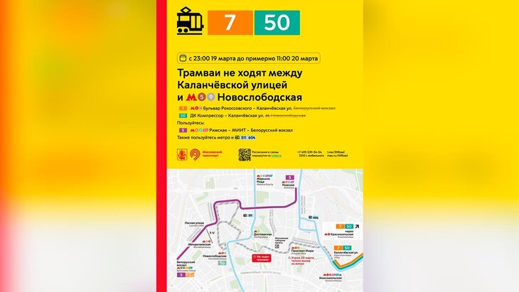 Граждан призвали пользоваться трамваем № 5, который курсирует от станции метро "Рижская" через Трифоновскую улицу и МИИТ до Белорусского вокзала. Кроме того, москвичи могут воспользоваться метрополитеном и автобусами № 511 и 604.