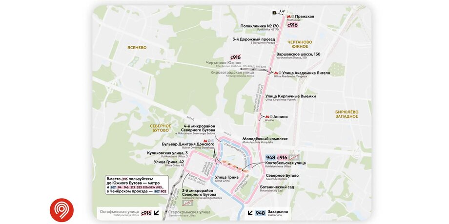 Вместо Старокачаловской улицы автобусы № 948 пойдут по бульвару Дмитрия Донского и Старобитцевской улице. Помимо этого, будет добавлено 7 новых остановок.