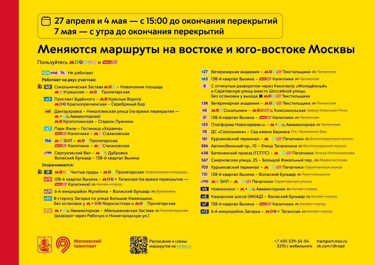 Транспортные маршруты в центре, на юго-востоке и востоке Москвы изменятся 25 и 27 апреля, 4 и 7 мая из-за перекрытий. Об этом сообщается в телеграм-канале столичного Дептранса.
