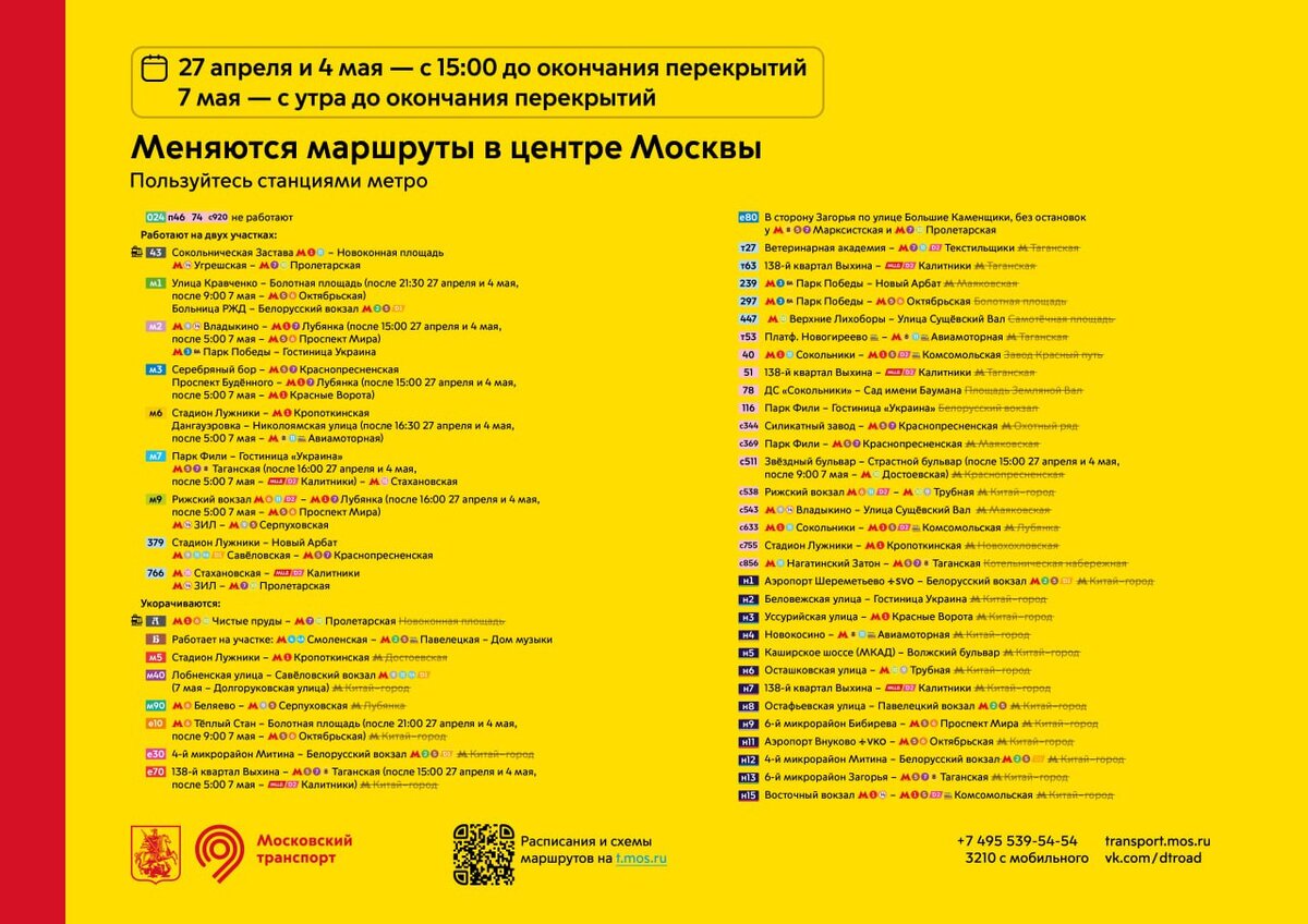 Кроме того, транспорт в центре Москвы будет ходить по измененным маршрутам и 25 апреля с 20:00 до конца перекрытий.