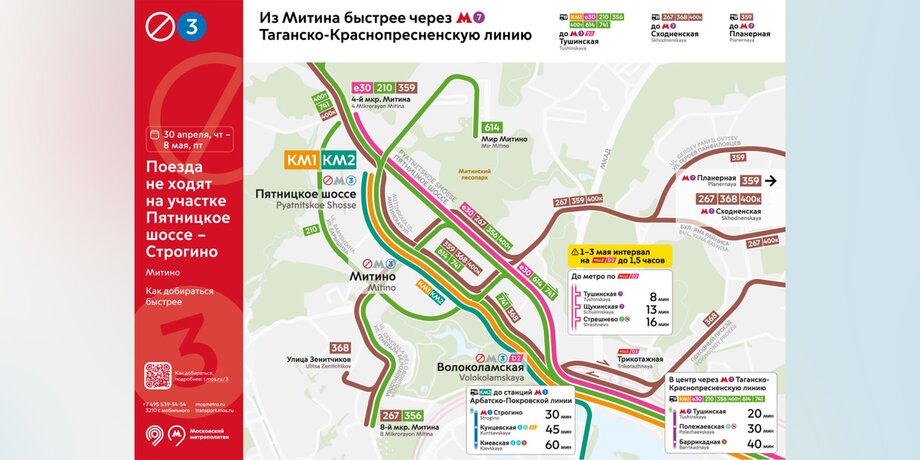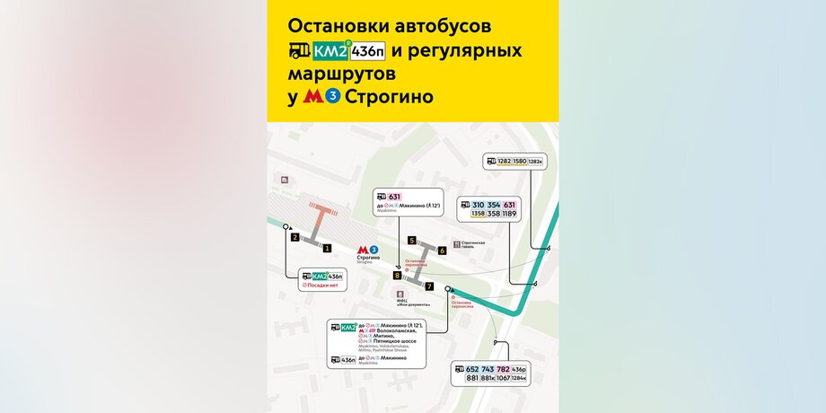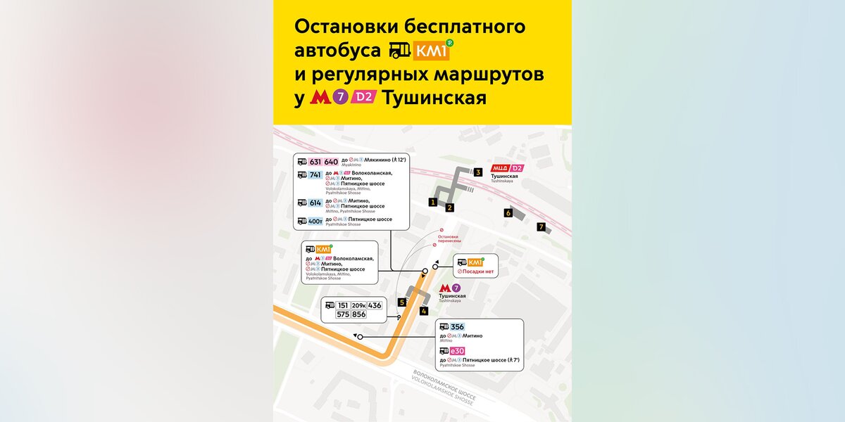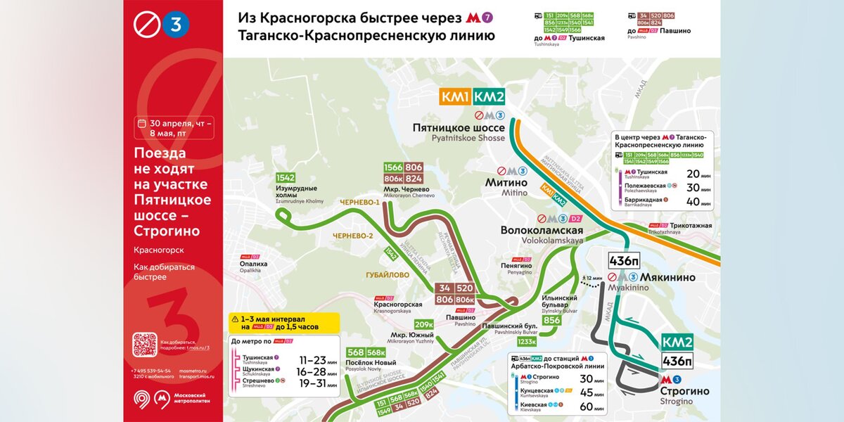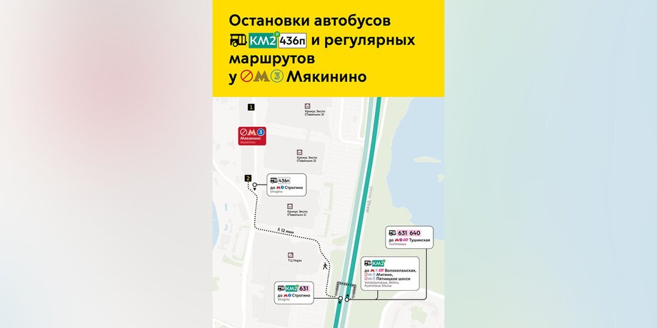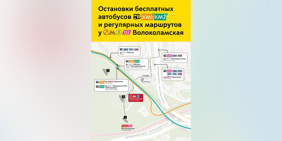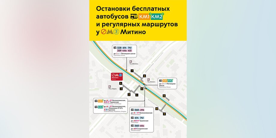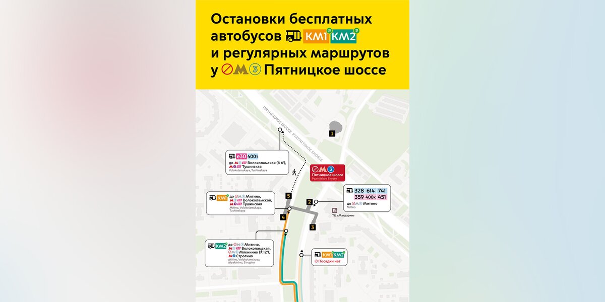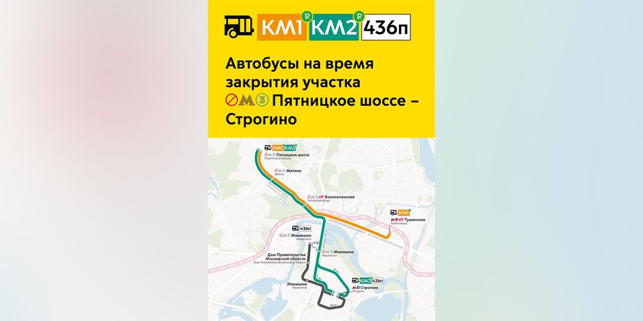 Маршрут КМ1 пройдет через станции "Пятницкое шоссе", "Митино", "Волоколамская" и "Тушинская". Автобусы КМ2 свяжут "Пятницкое шоссе", "Митино", "Волоколамскую", "Мякинино" и "Строгино".