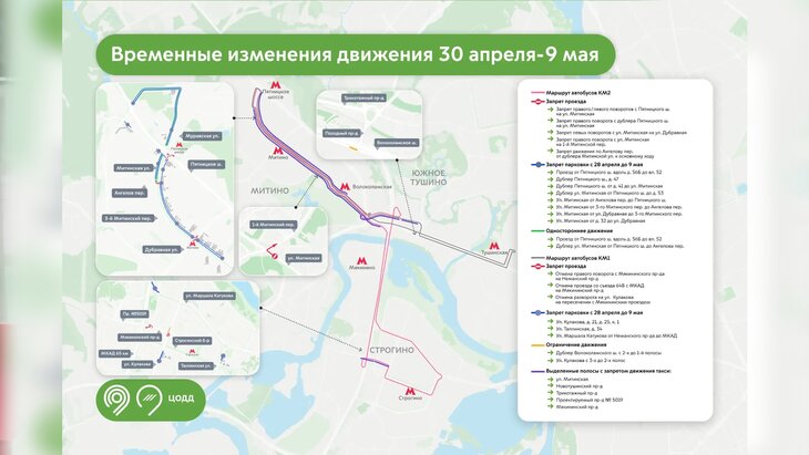 Изменения будут действовать с 30 апреля до 04:30 9 мая. В частности, часть поворотов в районе Пятницкого шоссе, улицы Митинской и Мякининского проезда временно недоступны. По временным выделенным полосам может ездить только городской транспорт.