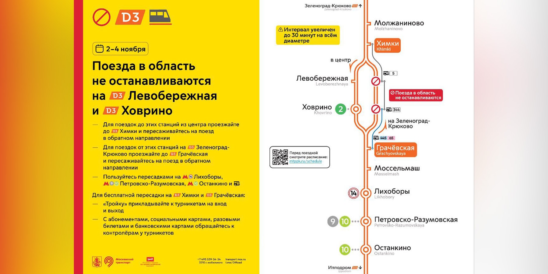 Пассажирам, которым нужна станция Ховрино, рекомендуют маршруты с пересадкой на станциях Грачевская (для поездок в область) или Химки (для поездок из центра). Для бесплатной пересадки необходимо приложить карту "Тройка" к турникетам на входе и выходе.