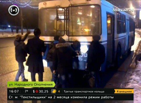 В итоге москвичам сообща удалось сдвинуть троллейбус с места.
