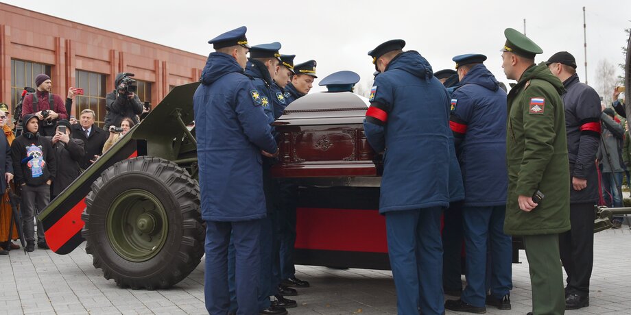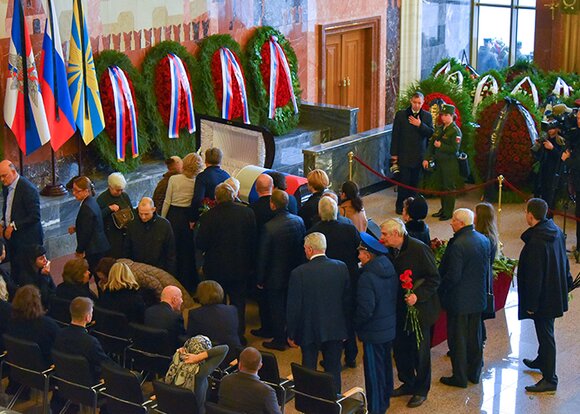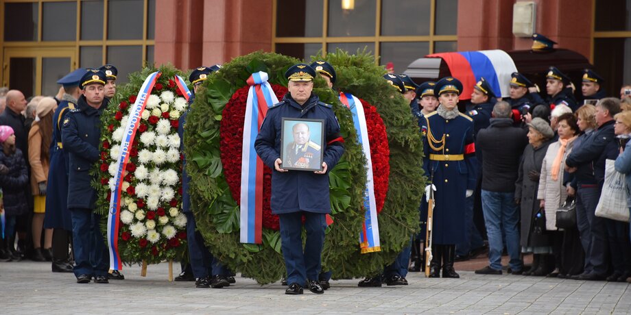 Гроб с телом космонавта доставили к месту захоронения в сопровождении военного караула и под звуки военного оркестра. На церемонию прощания пришли министр обороны России Сергей Шойгу, губернатор Московской области Андрей Воробьев, зампред Госдумы Ирина Яровая, родственники, друзья и коллеги космонавта.