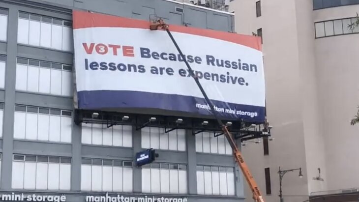 Речь идет о баннере, который висит на здании компании Manhattan Mini Storage. Лозунг на нем гласит: "Голосуй, потому что уроки русского языка дорогие". По мнению Сабельник, авторы подразумевали якобы имевшее место вмешательство властей России в американские выборы. Она добавила, что в этом есть этническая дискриминация, которая касается русскоязычных жителей США.