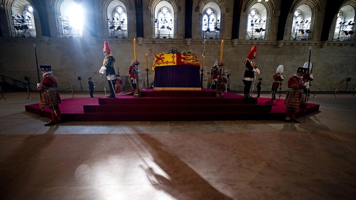 Гроб с телом Елизаветы II находится под круглосуточной охраной подразделений телохранителей британского монарха, Королевской гвардейской дивизии и церемониальных стражей лондонского Тауэра.