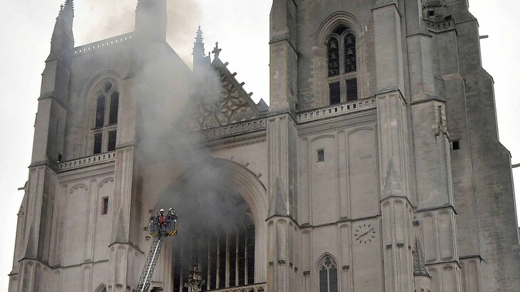 Собор Святых Петра и Павла загорелся утром 18 июля. Прибывшие на место пожарные не смогли уберечь от огня витражи времен Людовика XII и уникальный орган. Потушить возгорание удалось только спустя три часа.
