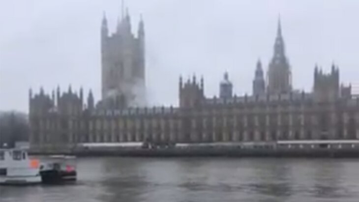 В соцсетях появились видео, на которых видно, как над зданием британского парламента поднимается дым. На записи также слышны звуки сигнализации.