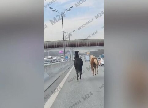 На кадрах видно, что лошади черной и коричневой окраски бегут по крайней левой полосе автодороги вблизи разделительного ограждения.