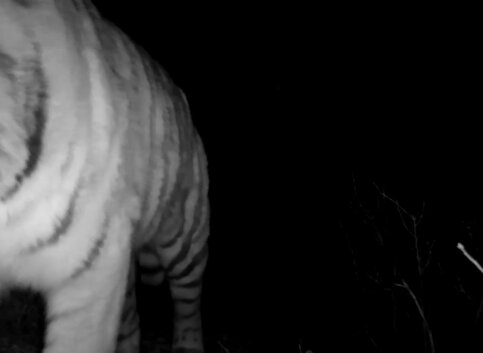 Укравший камеру хищник попал на видео соседней фотоловушки. Судя по кадрам, тигр нес в зубах "добычу", которая в это время продолжала съемку.