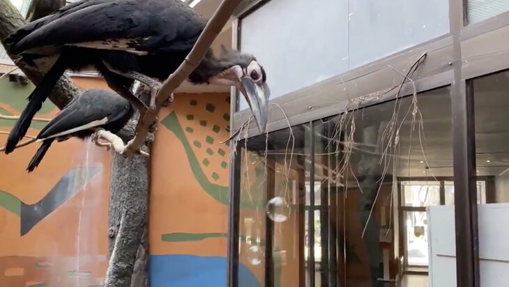 Кафрские рогатые вороны из Московского зоопарка развлекаются при помощи мыльных пузырей, которые они лопают клювами. Об этом рассказали в пресс-службе зоопарка.