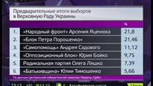 ЦИК Украины продолжает обрабатывать протоколы. В настоящий момент учтены уже 70 процентов. Первую строчку удерживает "Народный фронт" премьера Арсения Яценюка, с небольшим отрывом за ним следует "Блок Петра Порошенко", сообщает телеканал "Москва 24".
