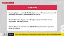 В Большом Кремлевском дворце состоялось подписание четырех договоров о принятии в состав Российской Федерации новых субъектов. Это Донецкая и Луганская народные республики, Запорожская и Херсонская области. Церемония прошла в Георгиевском зале. В мероприятии приняли участие президент, а также главы ДНР и ЛНР Денис Пушилин и Леонид Пасечник, руководитель Запорожской области Евгений Балицкий и глава Херсонской Владимир Сальдо. На церемонии президент выступил с речью.