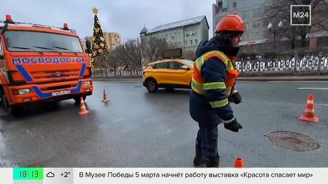 Специалисты убирают грязь и моют асфальт специальным раствором в Москве