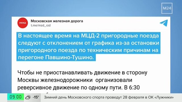 Пригородные поезда на МЦД-2 следуют с отклонением от графика из-за остановки состава