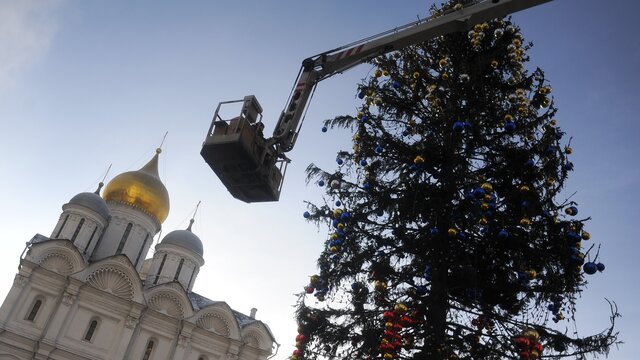 Дизайнеры украшают тридцатиметровую ель на Соборной площади