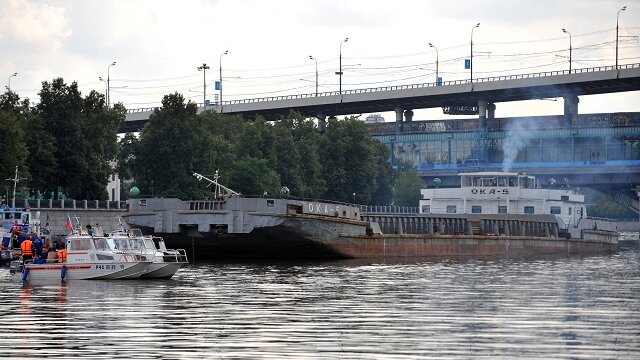 Грузовая баржа села на мель в районе Строгинского моста на Москве-реке