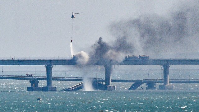 8 октября около 06:00 на автомобильной части моста произошел подрыв грузовика, после чего на ж/д пути загорелись семь топливных цистерн железнодорожного состава, следовавшего в направлении Крымского полуострова.
