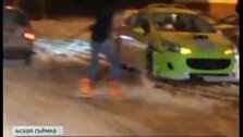 Молодой человек устроил опасный заезд напротив МГУ. Стоя на сноуборде, он прицепился к автомобилю с помощью троса, после чего машина тронулась. Скорость была невысокой, очевидно, сноубордист решил порадоваться наконец-то выпавшему снегу, которого так не хватало любителям зимних видов спорта. Повторять его трюк телеканал "Москва 24" не рекомендует.